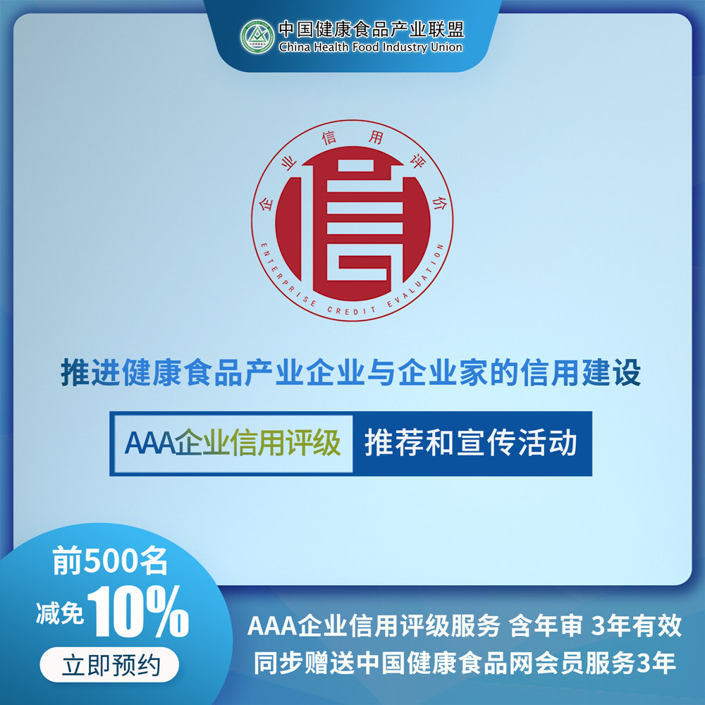 為貫徹中共中央、國務院《關于深化改革加強食品安全工作的意見》以及國家有關文件精神,促進健康食品產業企業誠信管理體系(以下簡稱“體系”)建設,提升食品質量安全,推動食品產業高質量發展,規范健康食品產業企業與企業家信用信息管理,推進健康食品產業企業與企業家信用體系建設,創新健康食品產業企業治理方式,完善誠信建設長效機制,提高全健康食品產業的誠信意識和信用水平,結合聯盟實際情況,中國健康食品產業聯盟決定開展關于推進健康食品產業企業與企業家的信用建設暨AAA企業信用評級推薦和宣傳活動,推進健康食品產業企業誠信管理體系建設,強化企業信用管理。詳情如下: